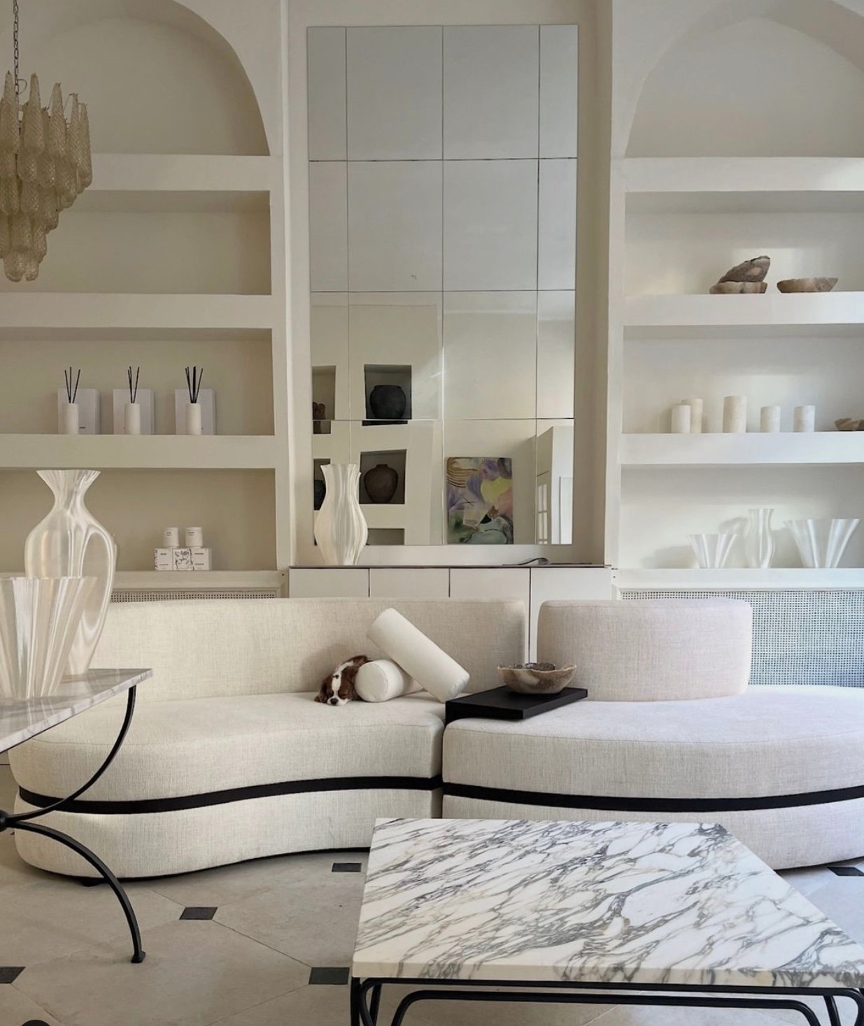 Custom sofas and table, designed to blend comfort with sculptural form. The sofas follow smooth, curved lines that enhance spatial harmony and reflect the soft geometry of the built-in niches and shelves. Upholstered in natural-toned fabrics, they add warmth and softness while maintaining a timeless aesthetic.