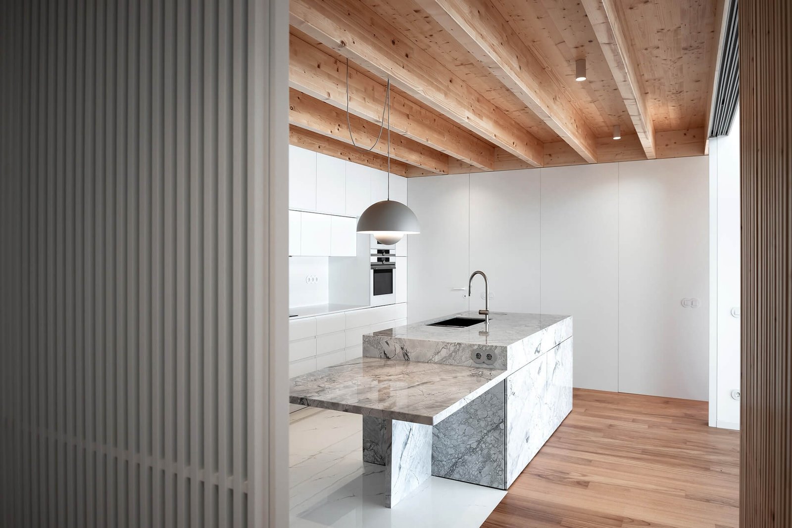 A cozinha é marcada por uma ilha central em pedra natural, desenhada à medida para o espaço e para as exigências do cliente. O projeto destaca-se por frentes de armário invisíveis, prateleiras flutuantes e uma linguagem estética serena e depurada, elementos que reforçam a ideia de um interior sofisticado, minimalista e altamente personalizado.